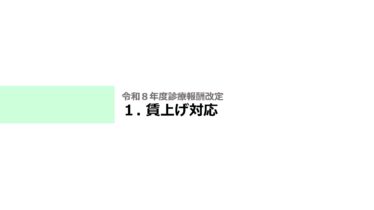 令和8年度診療報酬改定 【令和8年度診療報酬改定】医療従事者の処遇改善を完遂する「賃上げ」の全記録 令和8年度診療報酬改定の最重要テーマ「賃上げ対応」全16スライドをテキストで徹底解説。中医協の背景データを交え、3.2%・5.7%のベア目標、事務職・若手医師への対象拡大、令和9年度の段階的増額 、夜勤手当への充当、そして未実施施設への「121点減算」ペナルティの仕組みを詳述した完全ガイド。 2026.03.10 令和8年度診療報酬改定