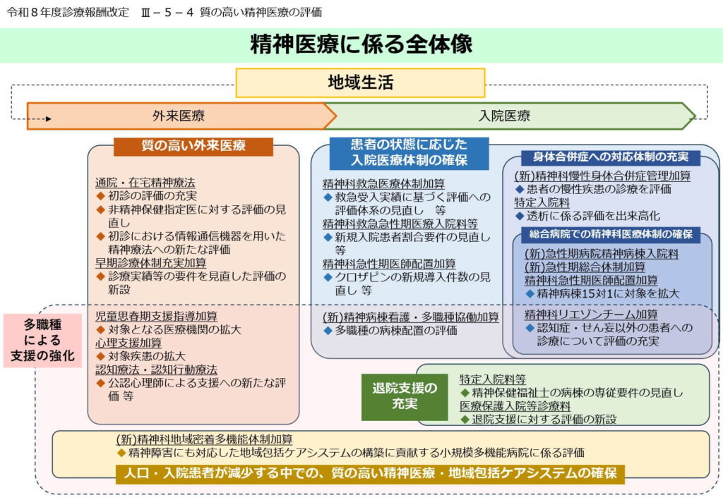 令和8年度診療報酬改定における「精神医療」分野では、精神疾患患者の急増と高齢化、そして「地域生活中心」という基本的理念に基づき、入院医療の機能分化と多職種連携の強化が柱となりました。