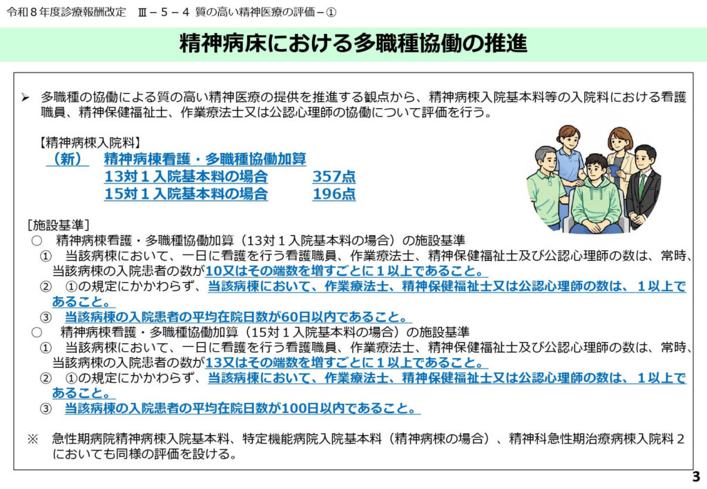精神病床において看護職員と多職種が密接に連携することを評価する「精神病棟看護・多職種協働加算」が新たに設けられました。