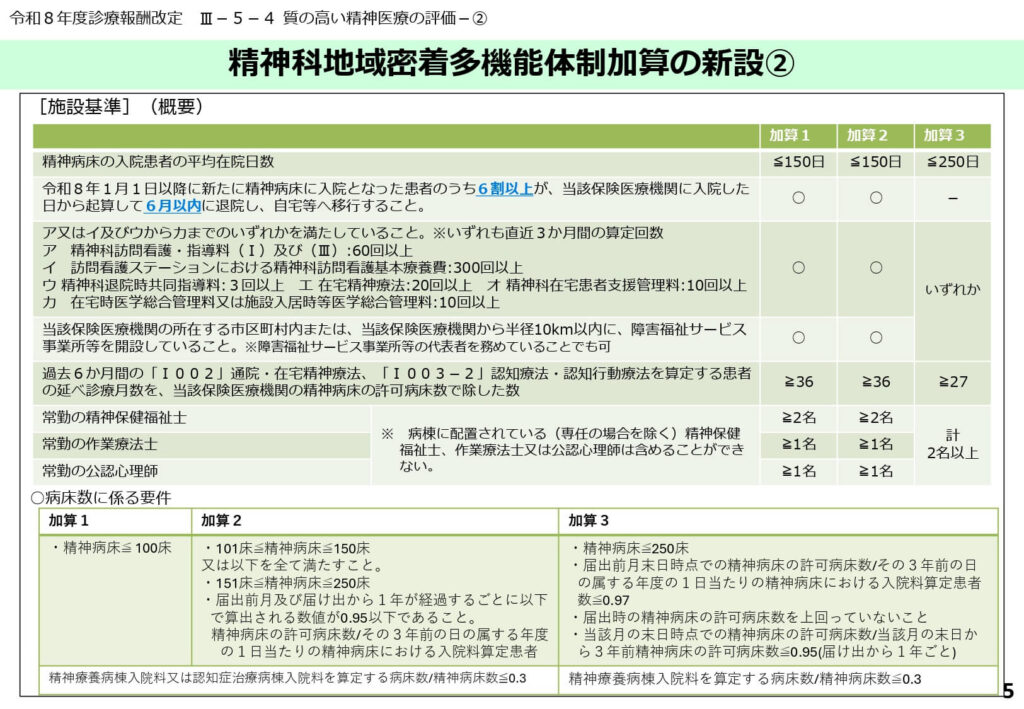 常勤の精神保健福祉士や公認心理師の配置も、病棟配置とは別に必要となるなど、極めて高い専門的体制が求められます。