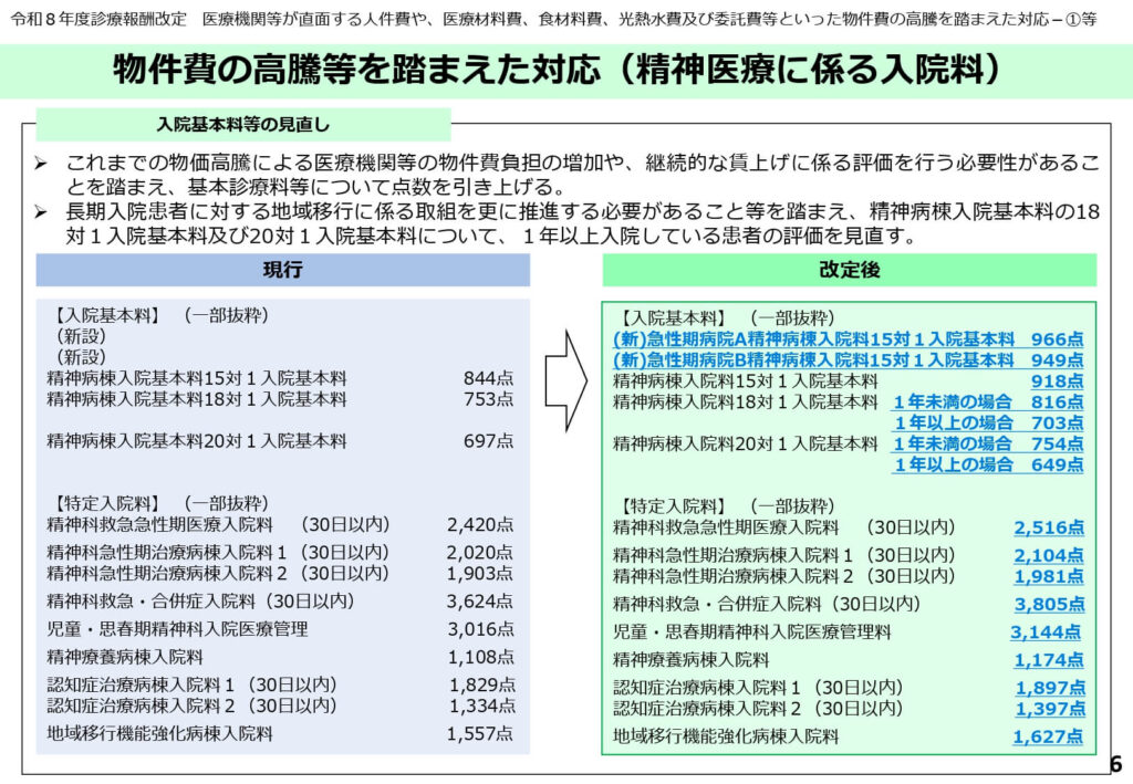 物件費高騰や賃上げに対応するため、精神医療に係る入院基本料や特定入院料の点数が引き上げられました。