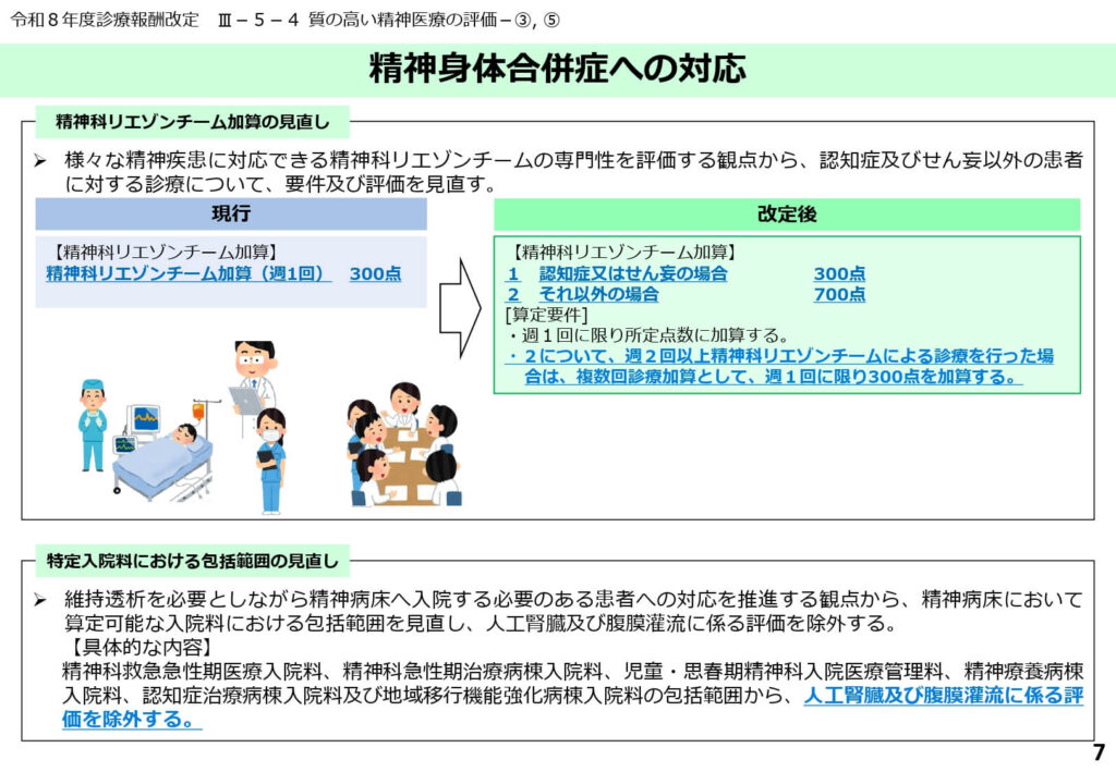 精神科リエゾンチーム加算の見直しと透析評価の出来高化