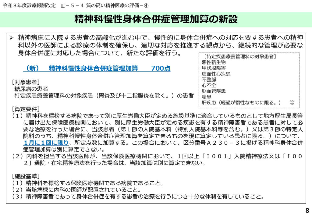高齢の精神疾患患者が増加する中、糖尿病などの慢性的な身体疾患を適切に管理することを評価する「精神科慢性身体合併症管理加算(700点)」が新設されました。