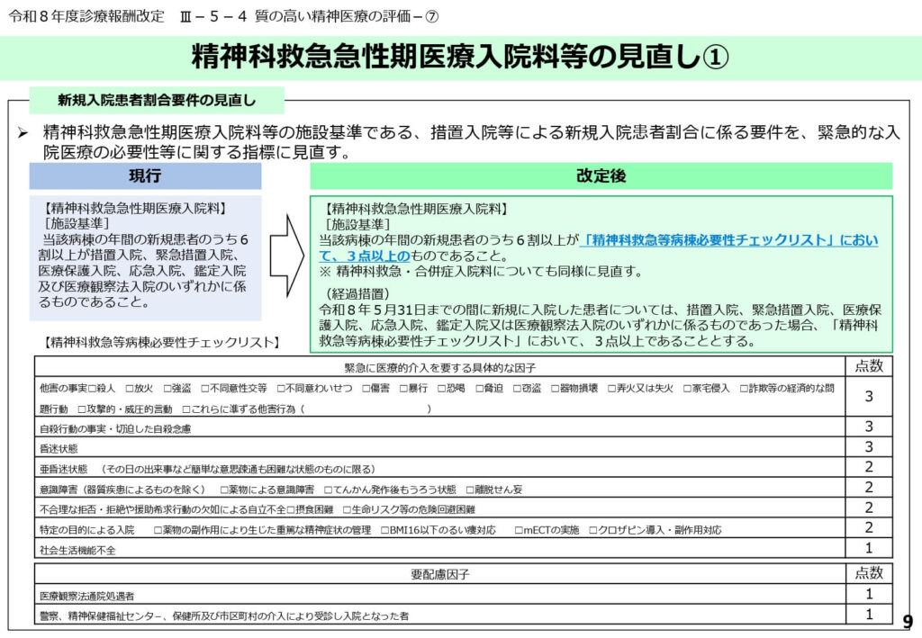 精神科救急の施設基準における新規入院患者の割合要件が、従来の入院形態ベースから「重症度チェックリスト」ベースへと刷新されました。