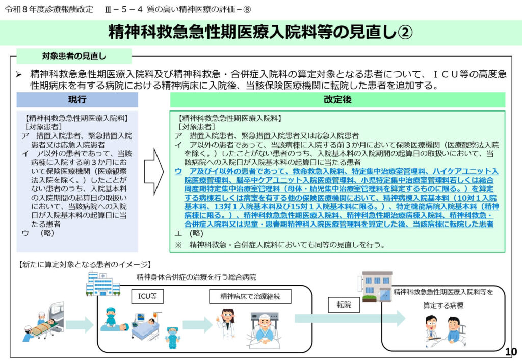 ICU等で身体的治療を終えた後の精神疾患患者を受け入れた場合も、精神科救急急性期医療入院料の算定対象に含まれるようになりました。