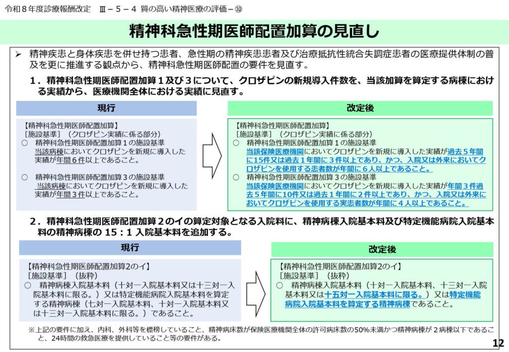 また、精神科急性期医師配置加算の対象に15対1入院基本料を算定する病棟が追加されるなど、対象範囲も広がりました。
