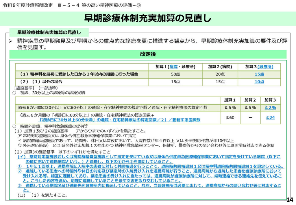 精神疾患の早期発見を評価する加算が見直され、診療所向けに加算3が新設されました。