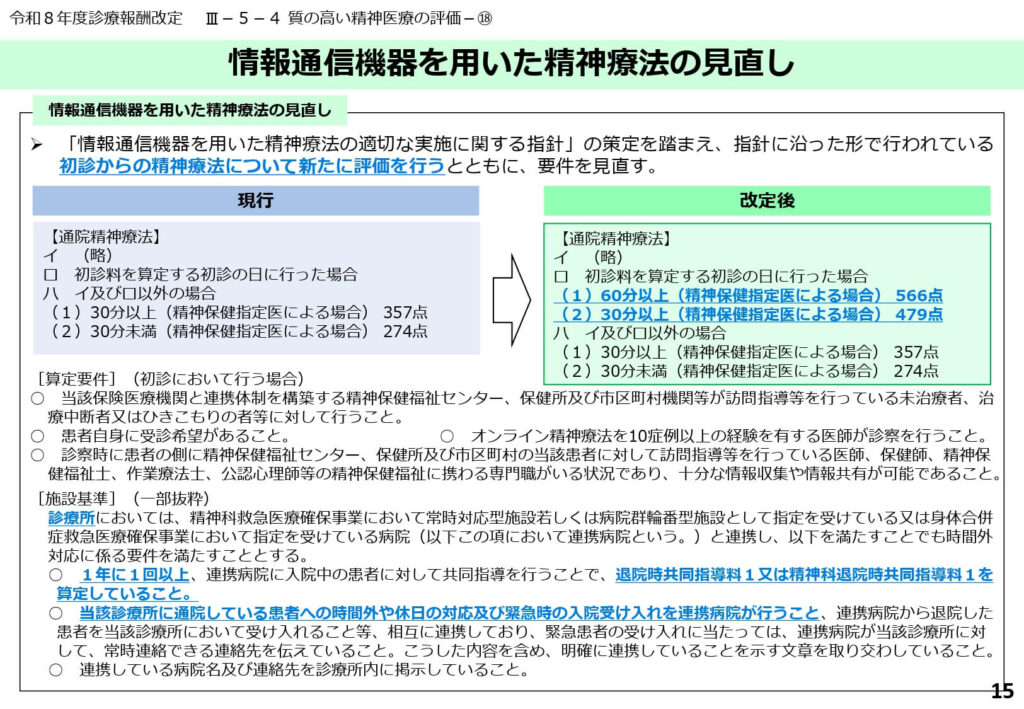 また、身体合併症への対応やオンライン精神療法の初診からの評価など、現代の医療ニーズに即した質の高い精神医療の提供体制が整備されました。