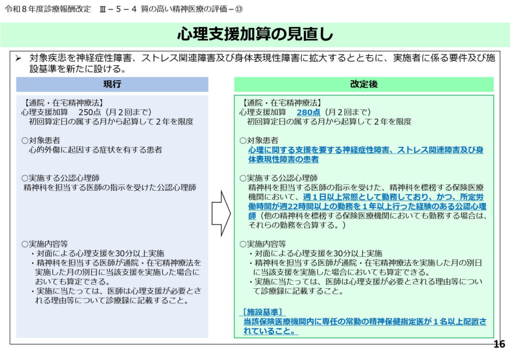 心理支援加算の対象に、新たに神経症性障害や不眠症などが加えられ、より多くの患者が心理的介入を受けられるようになりました。
