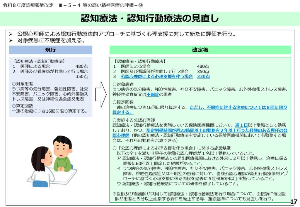 公認心理師が主導して実施する認知行動療法に対し、新たに330点の評価が新設されました。