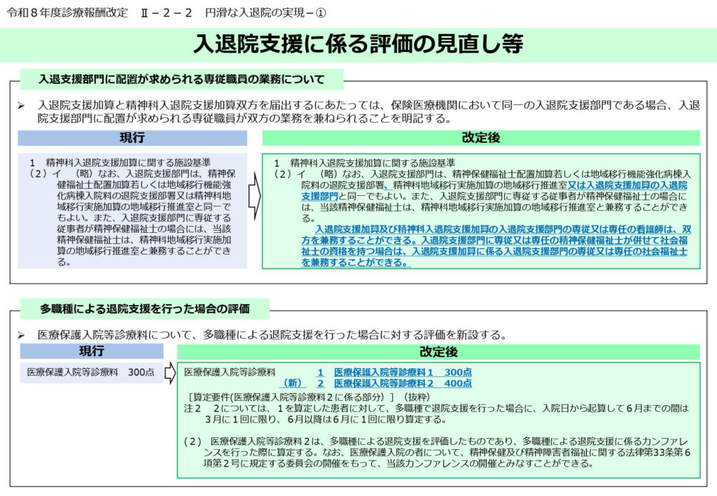 また、医療保護入院等診療料において多職種退院支援を行った場合の評価が新設され、困難な退院調整に対するインセンティブが強化されました。