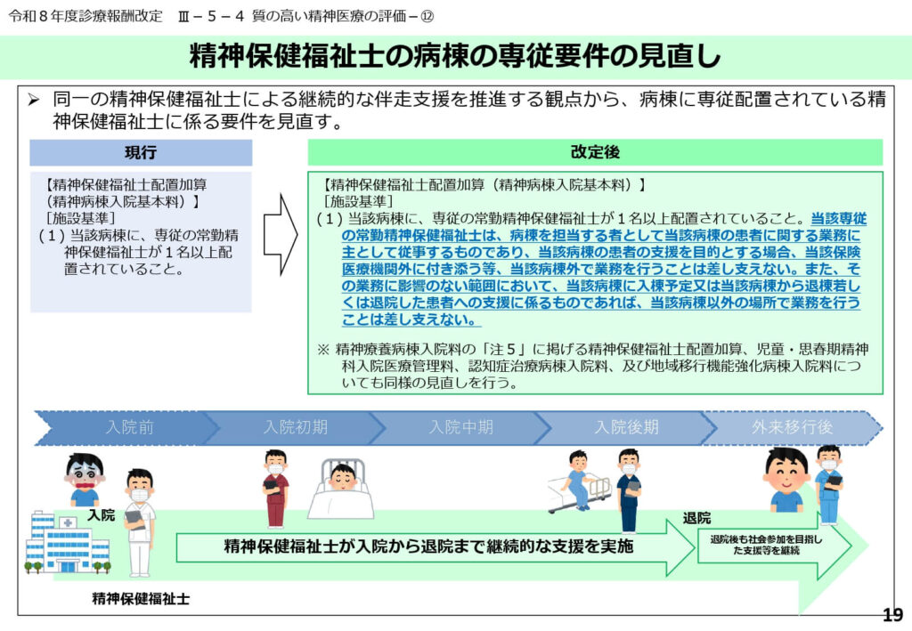 病棟専従の精神保健福祉士が、患者に同行して地域での活動を行うことなどが公式に認められました。