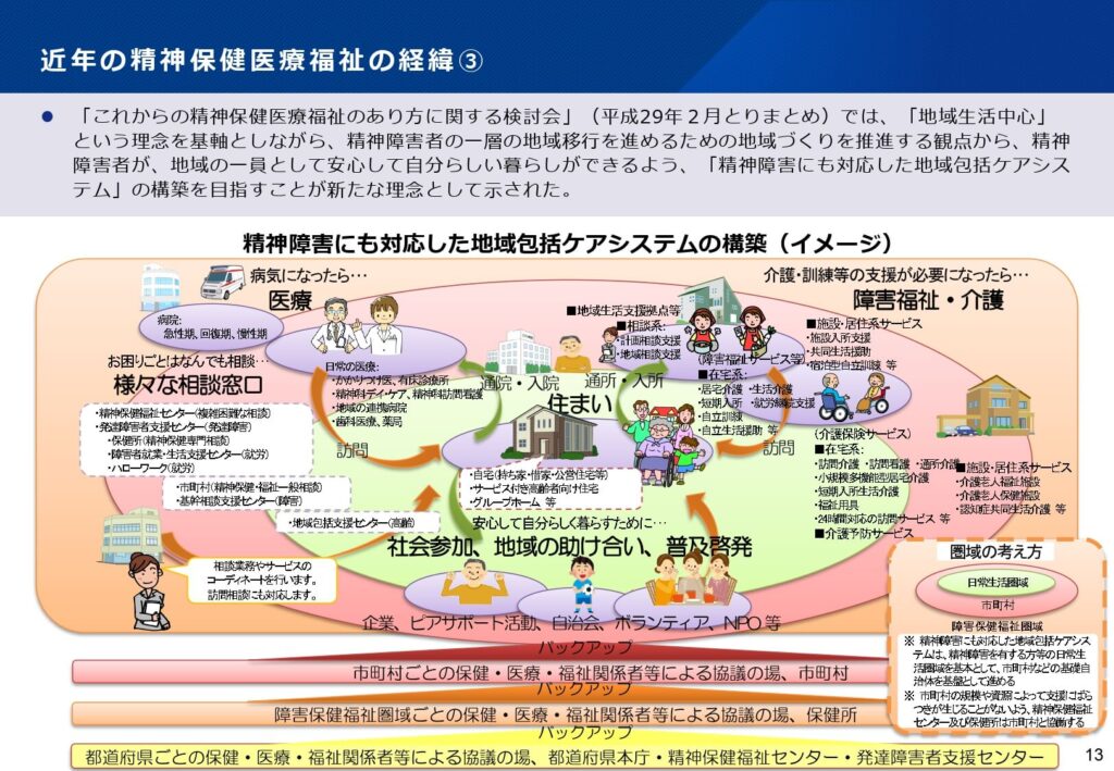 精神障害者が地域の一員として安心して自分らしい暮らしができるよう、「精神障害にも対応した地域包括ケアシステム」の構築が最優先課題として掲げられました。