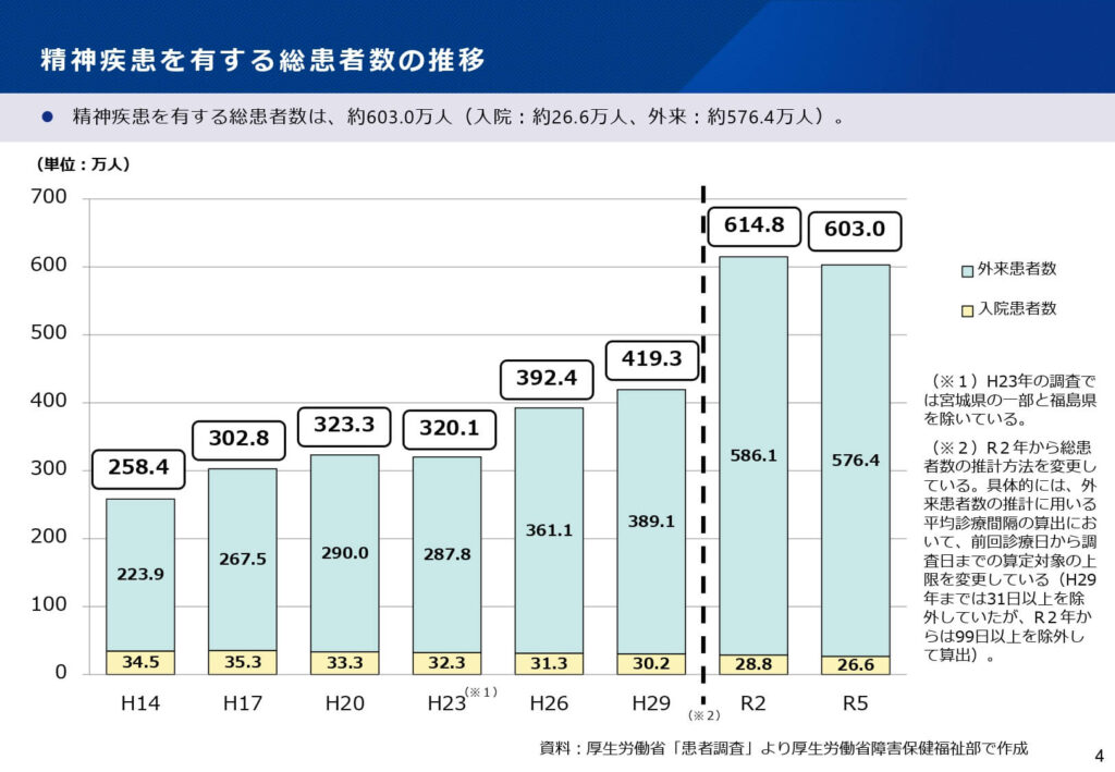 厚生労働省の患者調査によると、精神疾患を有する総患者数は約603万人に達しており、過去20年間で2倍以上に増加しています。